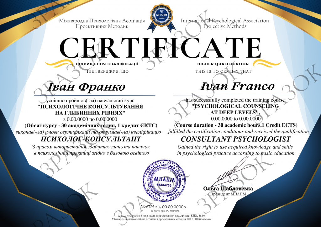 - Сертифікат 60 акад.год. спеціалізація ПСИХОЛОГ-КОНСУЛЬТАНТ